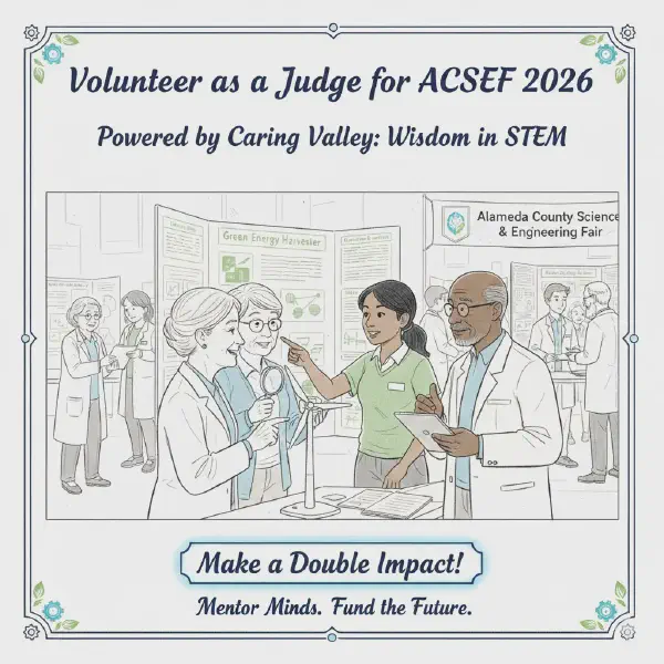 Caring Valley’s Wisdom in STEM program invites you to lend your invaluable experience as a volunteer judge for the 2026 Alameda County Science & Engineering Fair (ACSEF). This is a unique opportunity to directly mentor the next generation of innovators while providing essential support to one of our community’s most important educational events.
